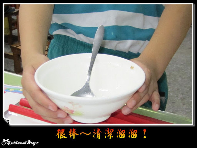 果然,在用餐快結束時,我照往常習慣檢查孩子是否有將食物吃完,發現有位孩子的碗底異常乾,顯然是沒有喝過湯。於是我要他去盛湯喝,但他卻面有難色,遲遲不肯動作,雖然人走到湯桶旁邊,可只有人站在那邊卻毫無舉動,還想趁我不注意就悄悄溜走。經過我呼喊數次後,終於盛了湯,走到我旁邊,對他再三曉以大義,他鼓起了勇氣,慢慢的將湯喝了下去。